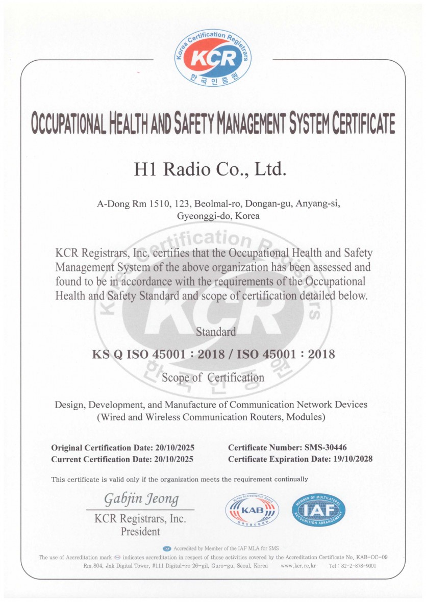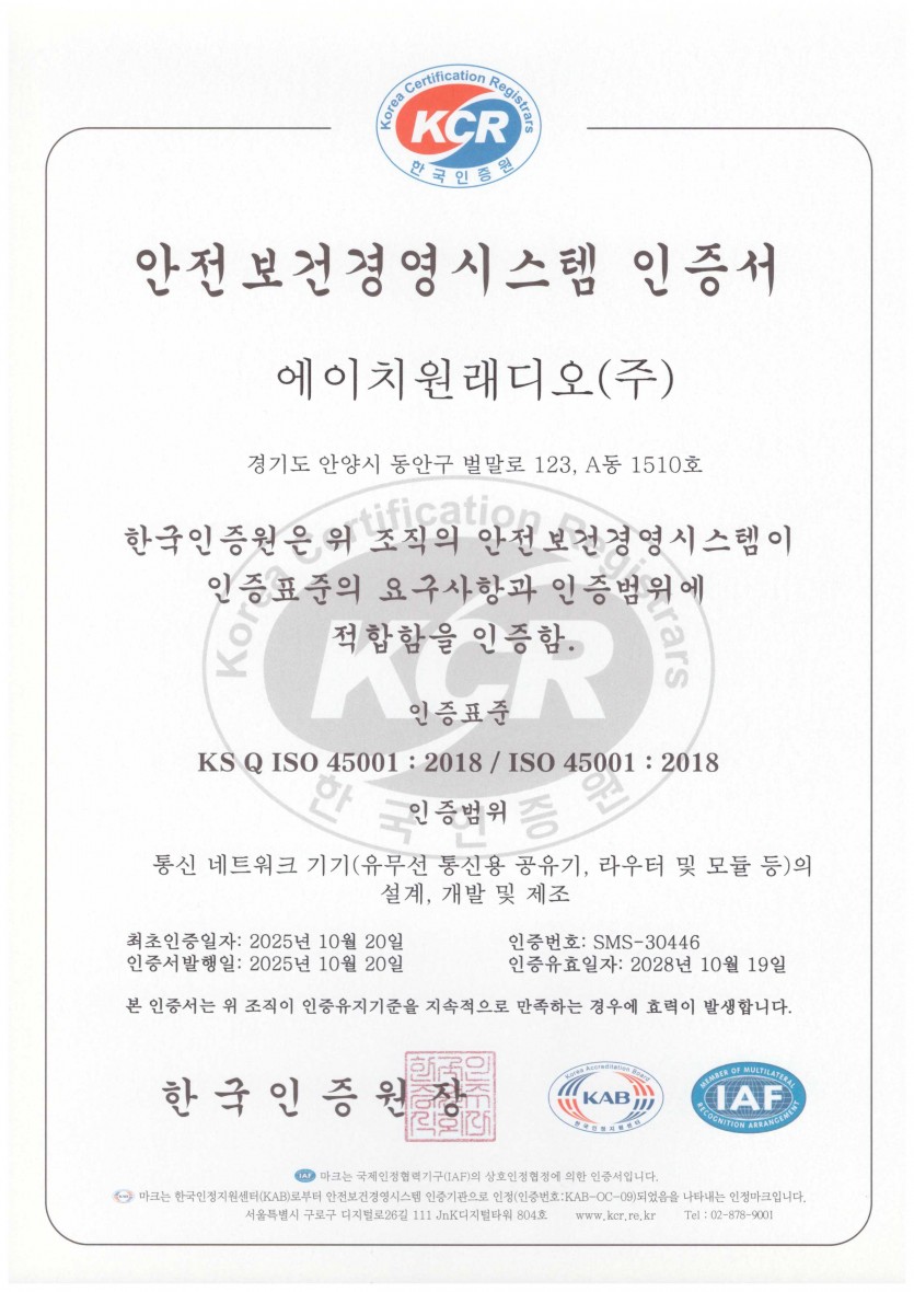 에이치원래디오(주)가 2025년10월 21일 ISO45001(안전보건경영) 인증을 취득하였습니다.